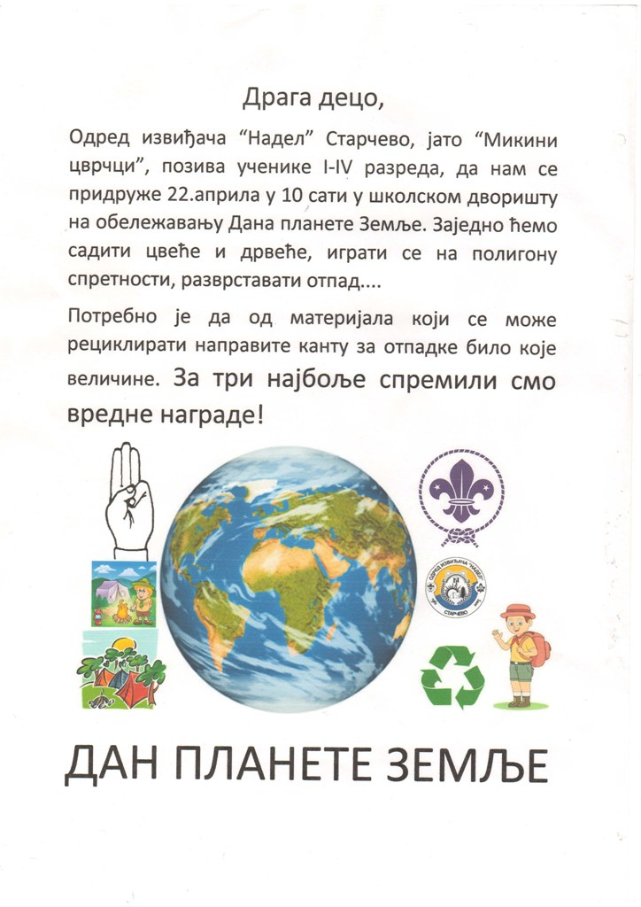 УЧЕНИЦИ НАШЕ ШКОЛЕ КОЈИ СУ ЧЛАНОВИ ОДРЕДА ИЗВИЂАЧА „НАДЕЛ“ ЈАТО „ МИКИНИ ЦВРЧЦИ“ СУ ОБЕЛЕЖИЛИ ДАН ПЛАНЕТЕ ЗЕМЉЕ.