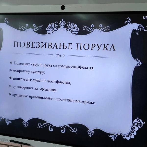Наставник српског језика и књижевности Драгомир Бурнаћ је кроз корелацију наставе књижевности и изборног предмета Вредности и врлине као животни компас кроз радионичарски тип часа са ученици обрадио ову комплексну и значајну тему.